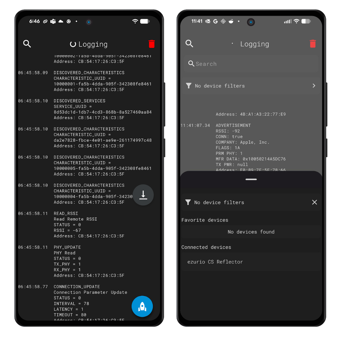 Capture every Bluetooth event in real time with detailed logging of connections, characteristics, and advertisement data. Easily filter, search, and review device activity for in-depth analysis and troubleshooting.