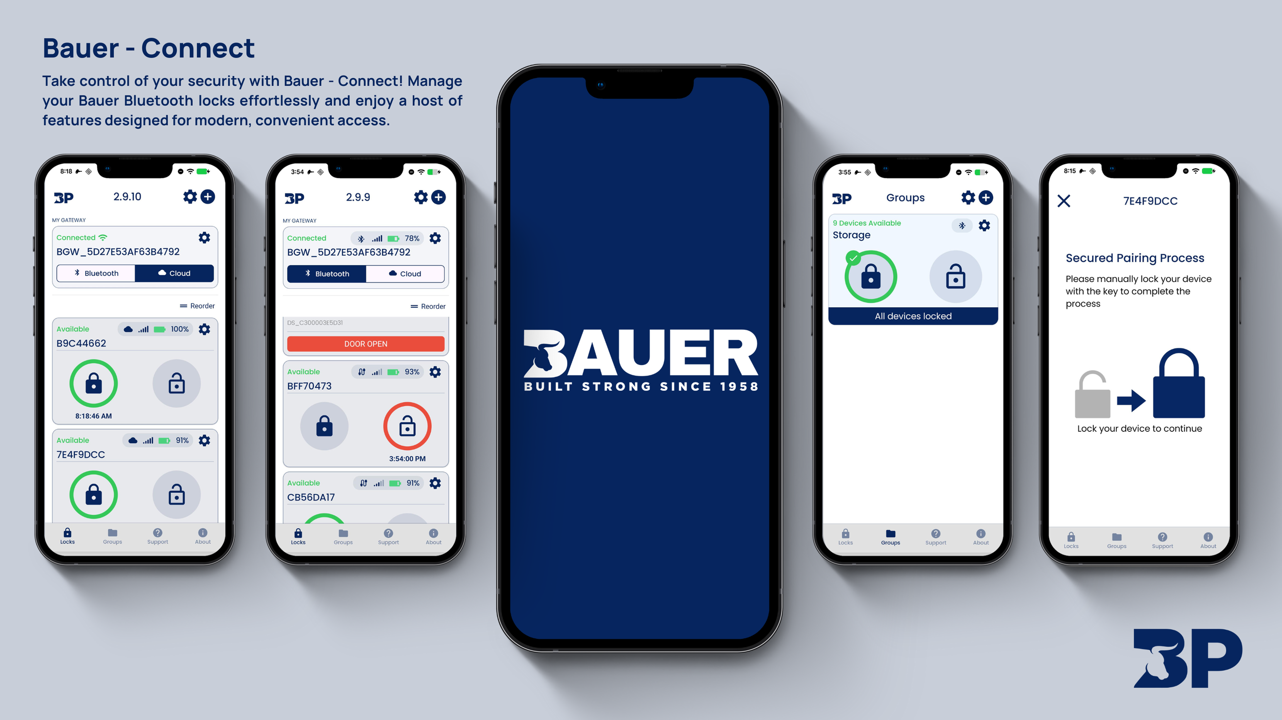 The Bauer Connect mobile application provides secure and convenient control of Bauer Bluetooth enabled locks.